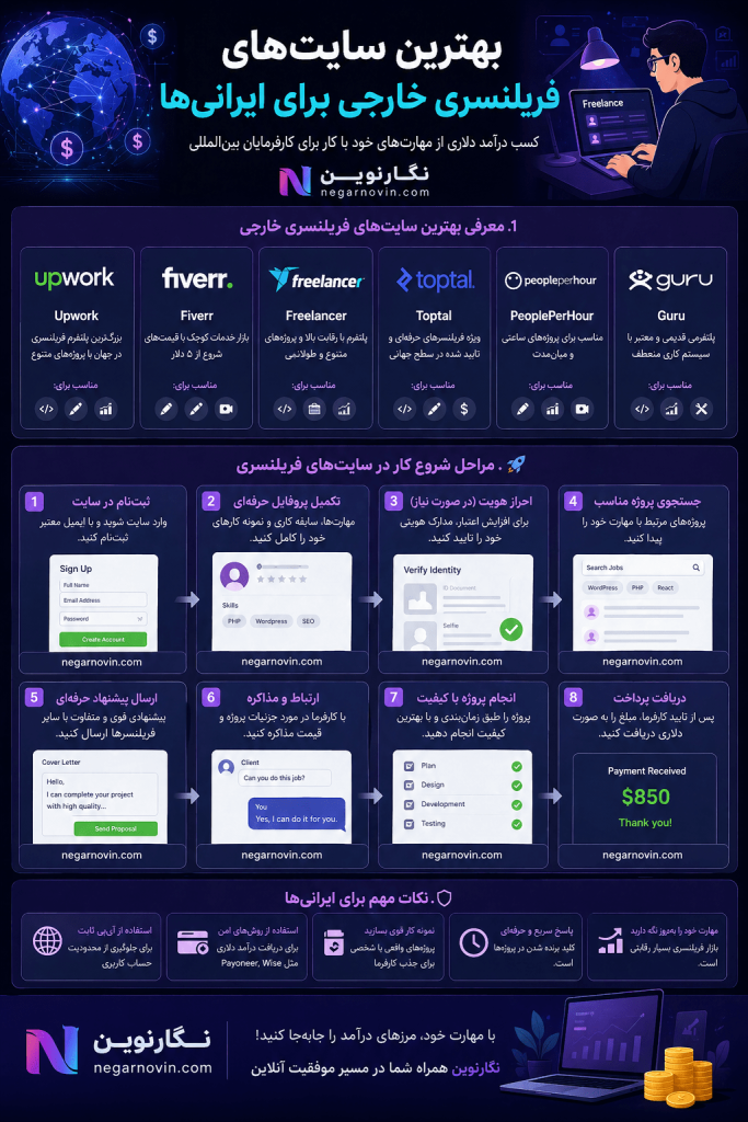 در این مقاله از نگارنوین (Negarnovin) بهصورت کامل و حرفهای بهترین سایتهای فریلنسری خارجی برای ایرانیها را بررسی میکنیم و مسیر واقعی درآمد دلاری را توضیح میدهیم.